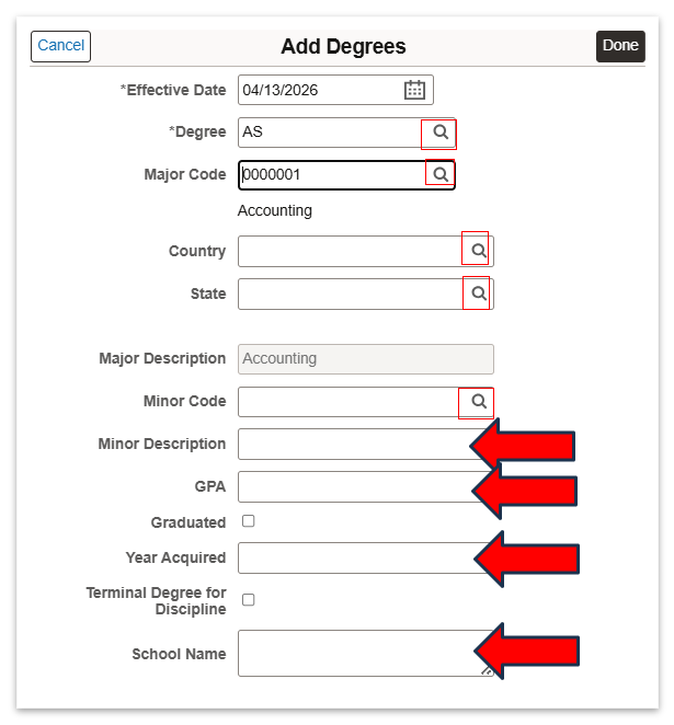 • For any field with a magnifying glass, use it to select an option (do not type manually).