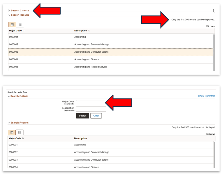 • Only the first 300 major codes appear under 'Search Results'.